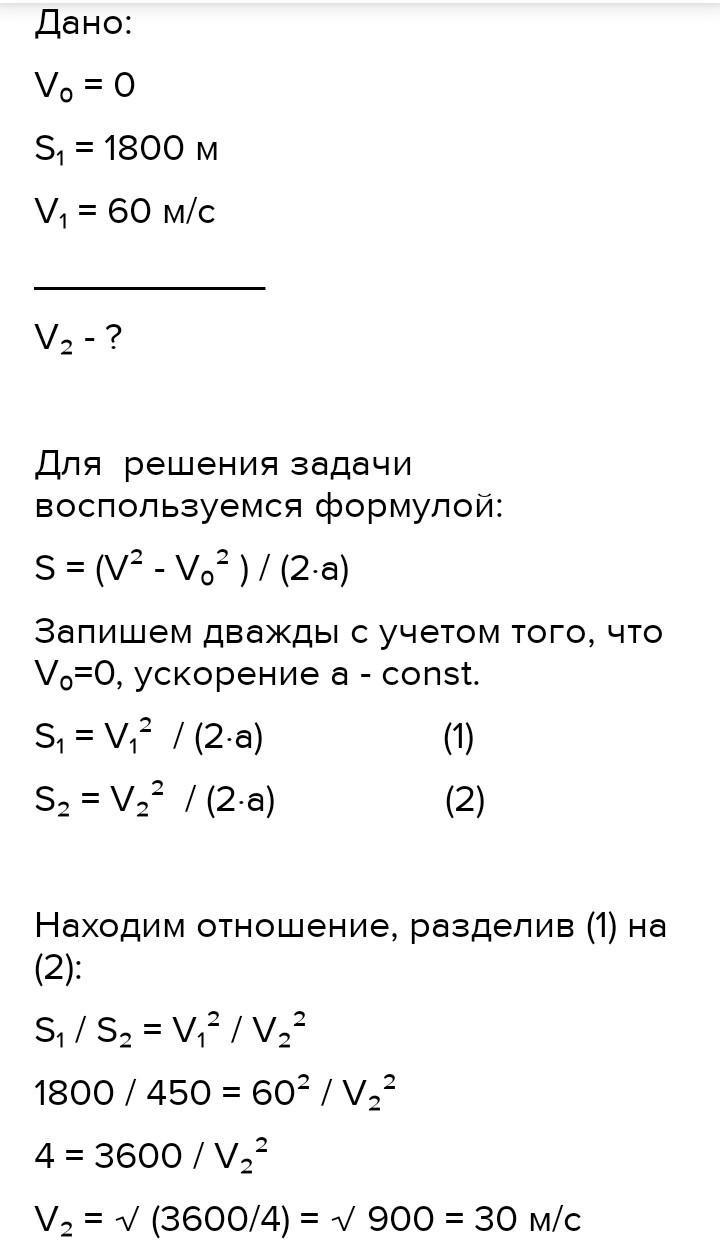 Літак доторкнувся посадкової смуги при швидкості 60 м/с та зупиняється пробігши 1800 м. Яка швидкість літака, коли він пробіг смугою 450 м?