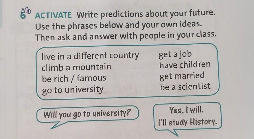 ACTIVATE Write predictions about your future. Use the phrases below and your own ideas. Then ask and answer with people in your class. live in a different country climb a mountain be rich / famous go to university get a job have children get married be a scientist Will you go to university? Yes, I will. I'll study History.