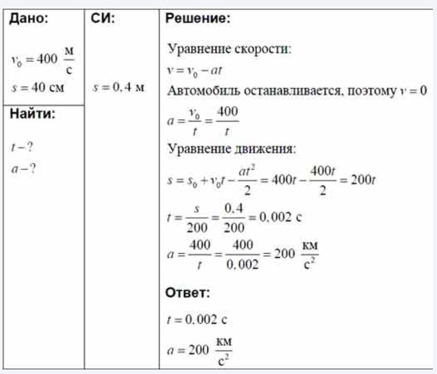 Пуля со скоростью 600 м/с ударяет в земляной вал и проникает в него на глубину 0,3 м. Определить ускорение и время движения пули внутри вала.