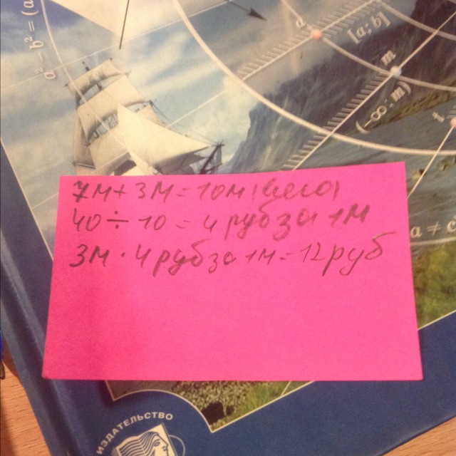 За два мотка веревки заплатили 40 рублей. В одном мотке 7 м веревки, в другом 3 м веревки. Сколько стоит меньший моток веревки?