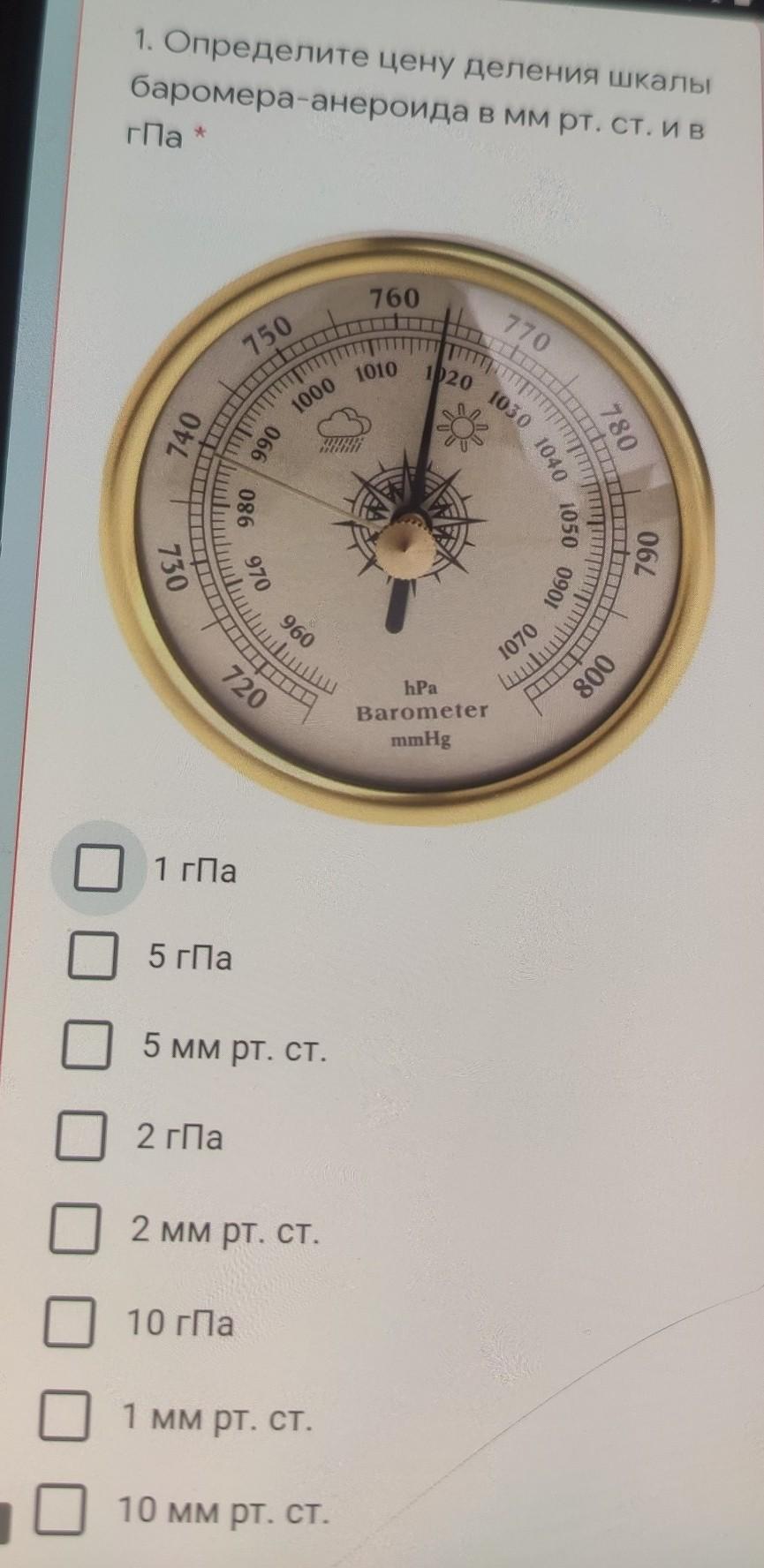 Пример определения цены деления: (970 гПа-960 гПа):10 дел=1 гПа, по аналогии опр. в мм рт ст, только рассм. другую шкалу