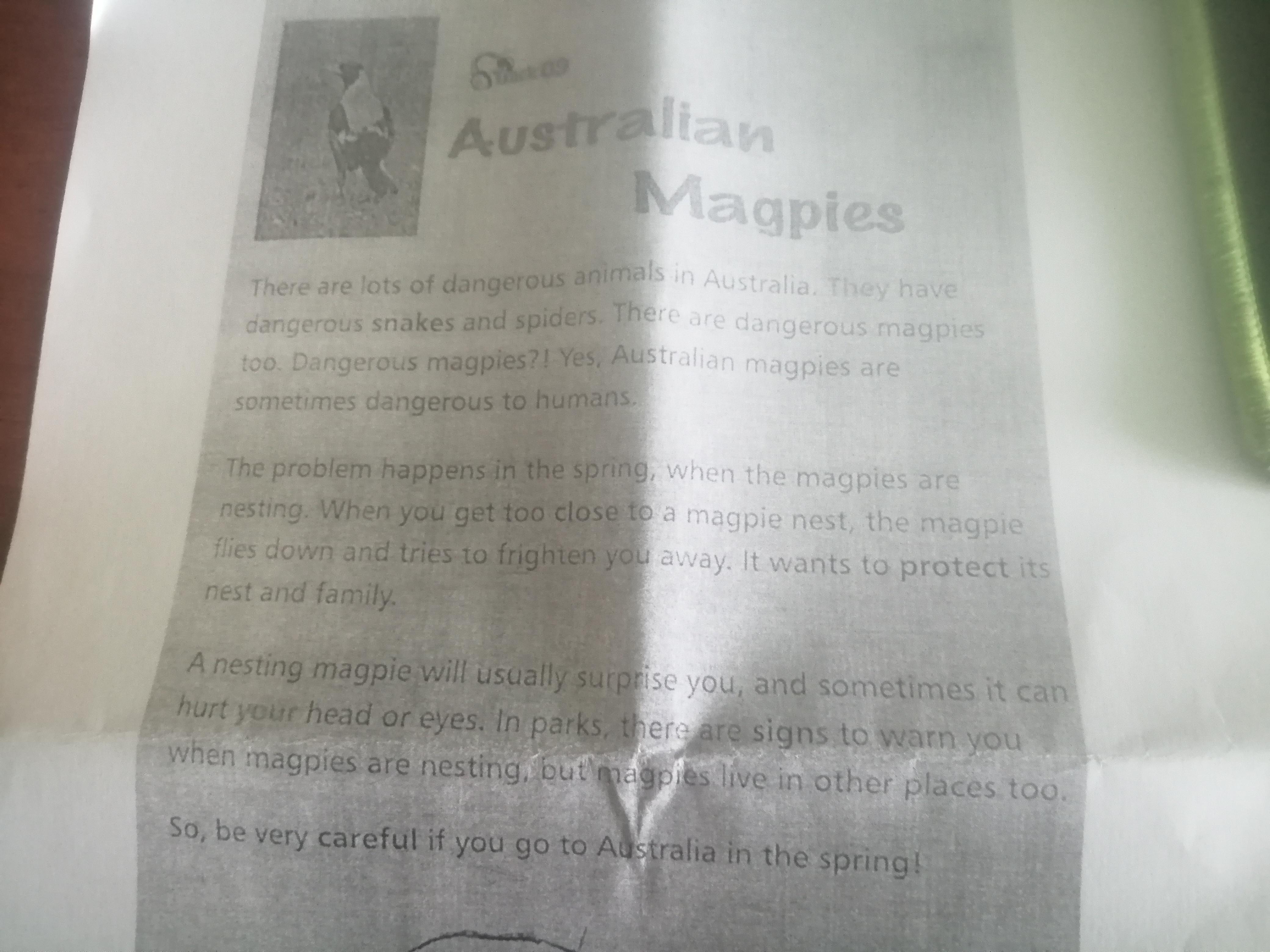 В Австралії багато небезпечних тварин. У них є небезпечні змії та павуки. Є й небезпечні сороки. Небезпечні сороки?! Так. Австралійські сороки іноді небезпечні для людини.