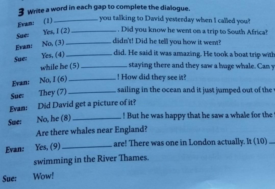 Evan: Sue: Evan: Sue: 3 Write a word in each gap to complete the dialogue. you talking to David yesterday when I called you? Did you know he went on a trip to South Africa? didn't! Did he tell you how it went? did. He said it was amazing. He took a boat trip with his parents staying there and they saw a huge whale. Can you believe it? ! How did they see it? sailing in the ocean and it just jumped out of the water. Evan: Sue: (1) Yes, I (2) No, (3) Yes, (4) while he (5) No, I (6) They (7) Did David get a picture of it? No, he (8) ! But he was happy that he saw a whale for the first time. Are there whales near England? Yes, (9) are! There was one in London actually. It (10) swimming in the River Thames. Wow! Evan: Sue: Evan: Sue: