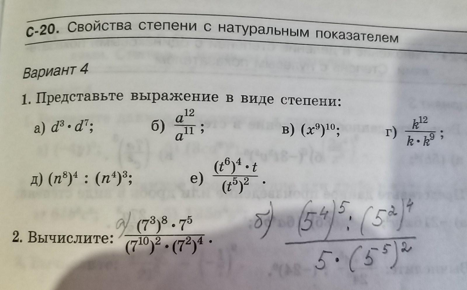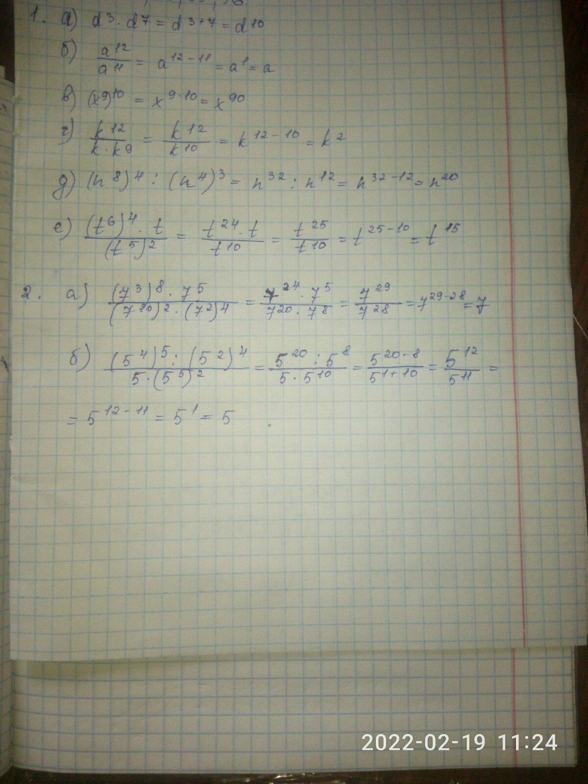 1)d^3*d^7=d^10 2)a^12/a^11=a 3)(a^9)^10=a^90 4)n^32/n^12=n^20 5)t^25/t^10=t^15