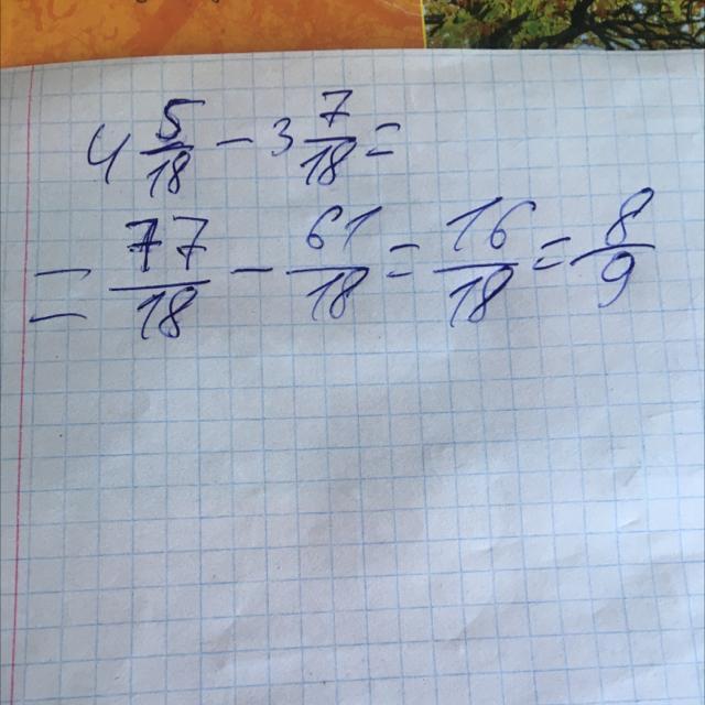 сколько будет 4 целых 5/18 - 3 целых 7/18?