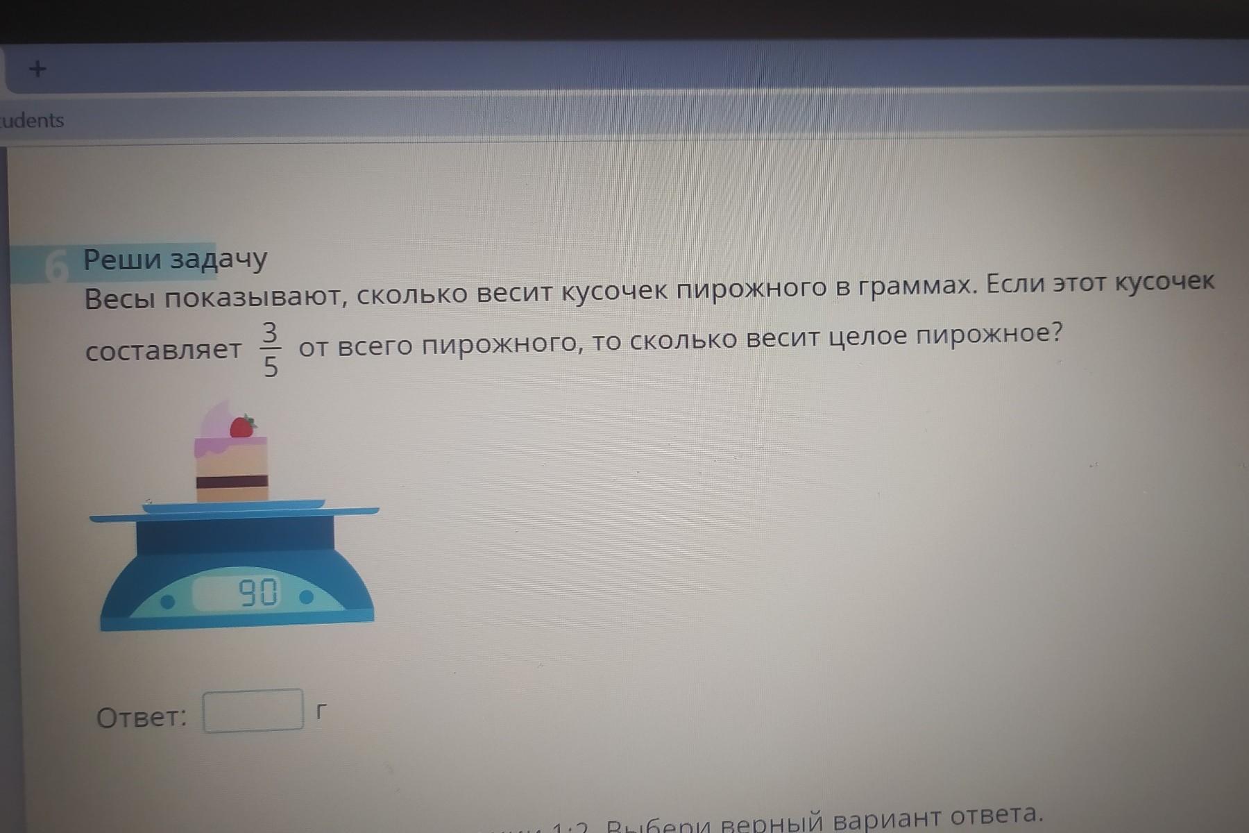 90 : 3 * 5 = 150 (г) - вес целого пирожного