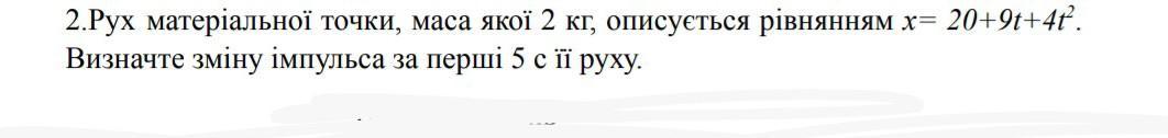 2.Pух матеріальної точки, маса якоï 2 кг, описується рівнянням х= 20+9+4t² Визначте зміну імпульса за перші 5 с її руху.