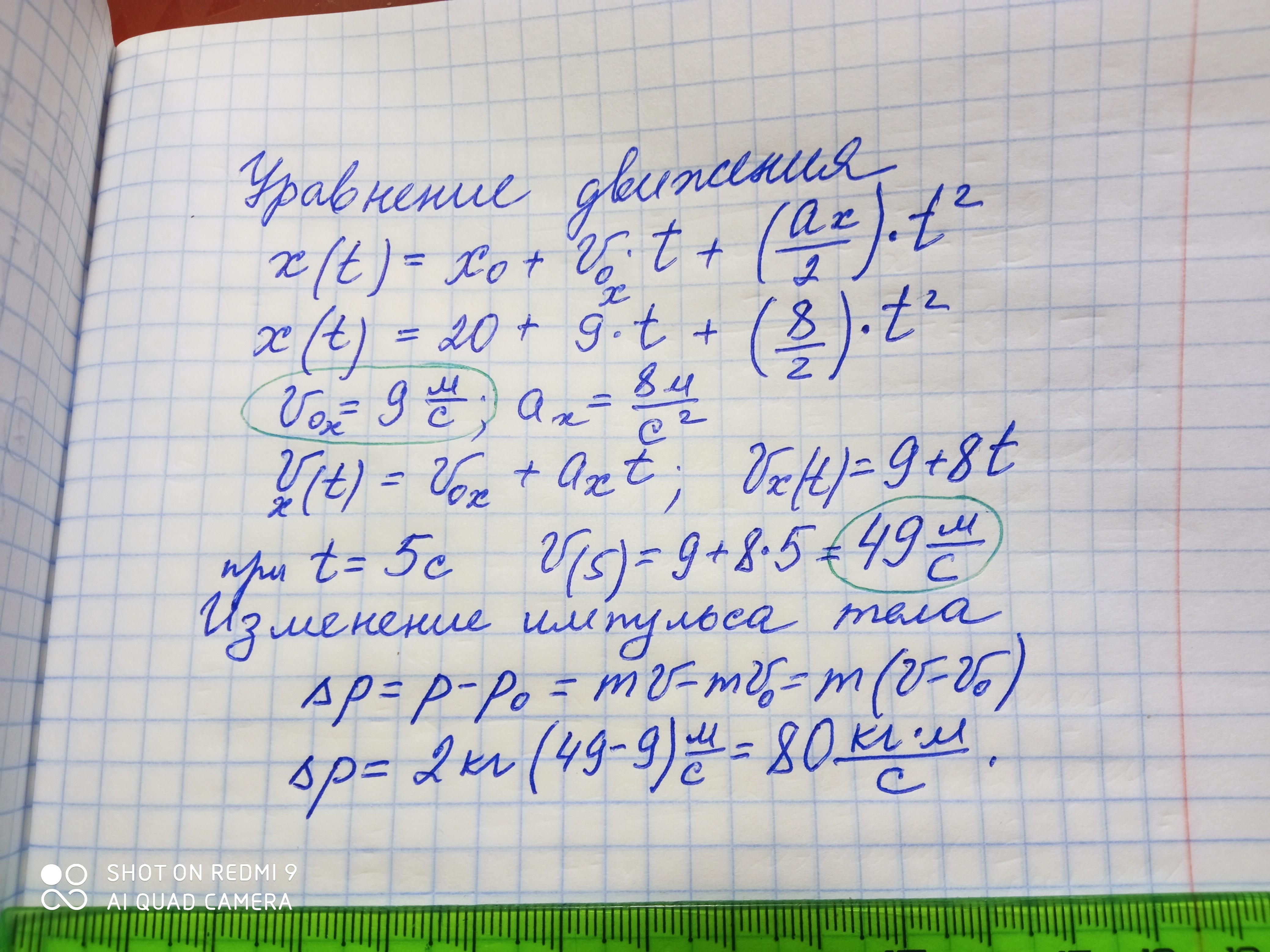 Движение материальной точки, масса которой 2 кг, описывается уравнением х= 20+9t+4t², Определите изменение импульса за первые 5 с движения.
