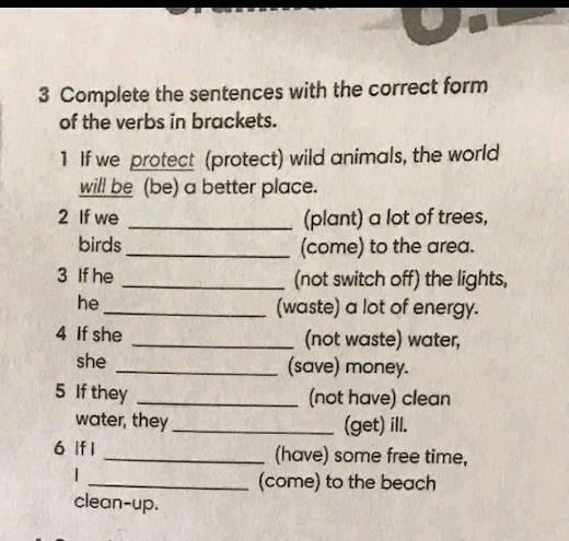 3 Complete the sentences with the correct form of the verbs in brackets. 1 If we protect (protect) wild animals, the world will be (be) a better place. 2 If we (plant) a lot of trees, birds (come) to the area 3 if he (not switch off) the lights, he (waste) a lot of energy 4 If she (not waste) water, she (save) money. (not have) clean water, they (get) il 6 fi (have) some free time, 1 (come) to the beach clean-up 5 If they