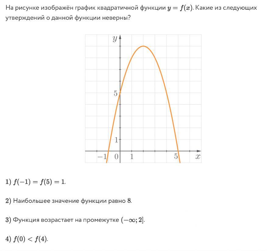 - Утверждение 4 неверное, так как f(0) = 5 и f(4) = 5, т.е. f(0) = f(4).