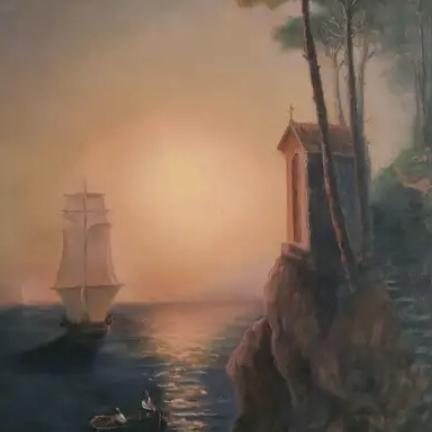 На этой картине Айвазовский изобразил море спокойным и мроутворённым, на небе стоит яркий закат солнца, корабль тихо уплывает в даль, на берегу суши стоит маленькая землянка