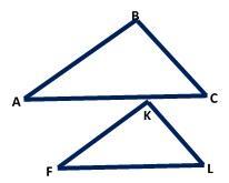 На рисунке представлены два подобных треугольника. Угол C первого равен углу L второго и составляет 650. Сторона AC первого 19,5 см, а сторона FL второго равна 13,0 см. При этом сторона BC первого = 12,0 см, а сторона FK второго = 12,0 см. Найдите длины стороны AB первого и KL второго.
