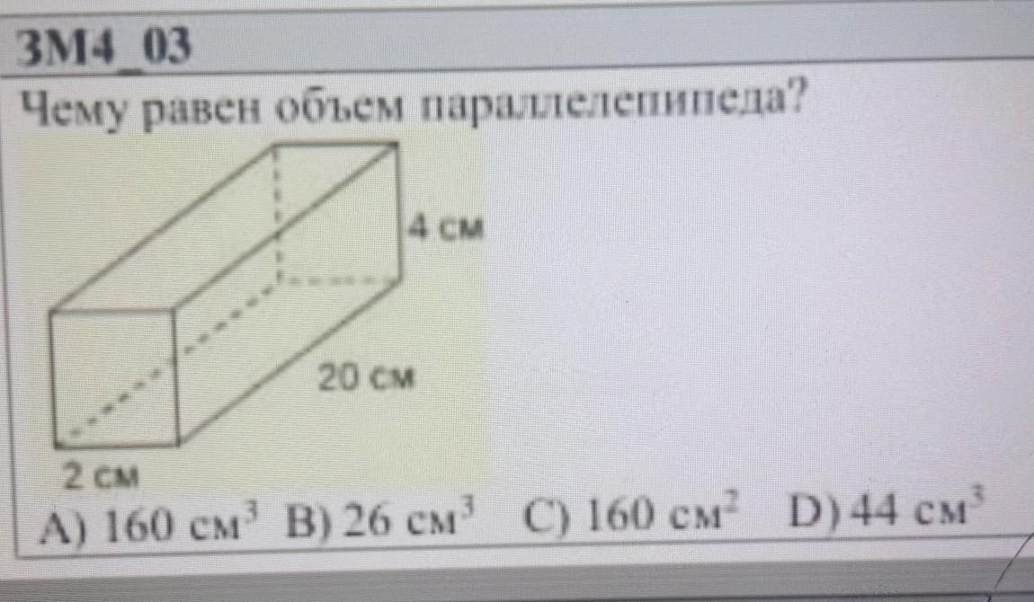 Чему равен объем параллелепипеда? высота:4 см длина:20 см ширина: 2 см A) 160 см3 В) 26 см3 С) 160 см2 D) 44 см 3