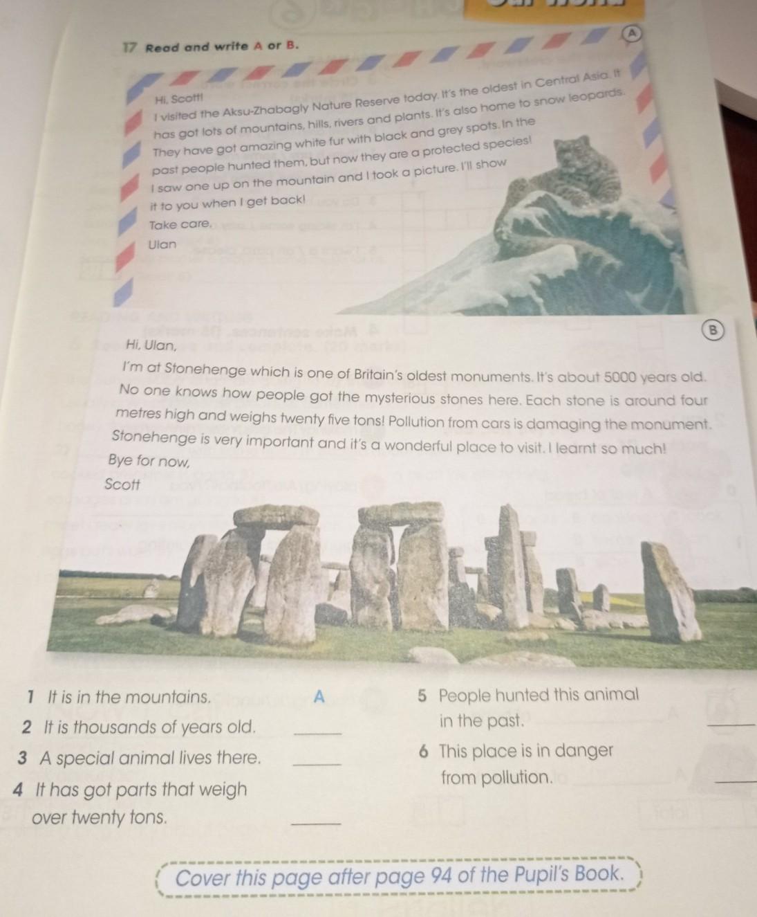 Our World 17 Read and write A or B. (А) Hi, Scott! I visited the Aksu-Zhabagly Nature Reserve today. It's the oldest in Central Asia. It has got lots of mountains, hills, rivers and plants. It's also home to snow leopards. They have got amazing white fur with black and grey spots. In the past people hunted them, but now they are a protected species! I saw one up on the mountain and I took a picture. I'll show it to you when I get back! Take care, Ulan B Hi, Ulan, I'm at Stonehenge which is one of Britain's oldest monuments. It's about 5000 years old. No one knows how people got the mysterious stones here. Each stone is around four metres high and weighs twenty five tons! Pollution from cars is damaging the monument. Stonehenge is very important and it's a wonderful place to visit. I learnt so much! Bye for now, Scott is in the mountains. A is thousands of years old. 5 People hunted this animal in the past. 6 This place is in danger from pollution special animal lives there. has got parts that weigh er twenty tons. Cover this page after page 94 of the Pupil's Book. 65
