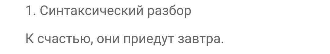 Ответ: К счастью, они приедут завтра.-Повествовательное, простое,невосклицательное, нераспространенное.- к счастью (пунктир), они-местоимение(дугой), приедут- глагол-двумя чертачками, завтра-пунктир точка._.