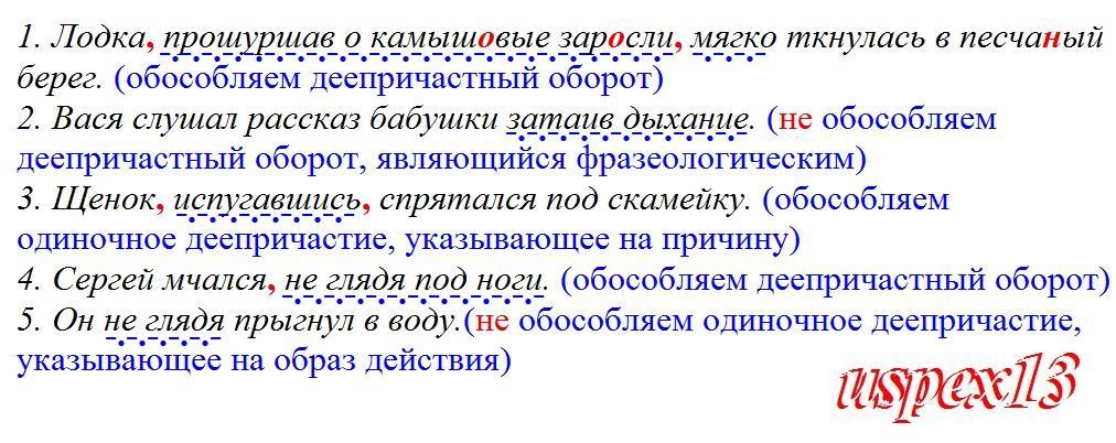 Перепишите предложения, подчеркните обстоятельства, расставыте знаки препинания и в скобках дайте объяснение, почему поставили или не поставили запятые. 1. Лодка прошуршав о камыш...вые зар...сли мягко ткнулась в песча...ый берег. 2. Вася слушал рассказ бабушки затаив дыхание. 3. Щенок испугавшись спрятался под скамейку. 4. Сергей мчался не глядя под ноги. 5. Он не глядя прыгнул в воду.