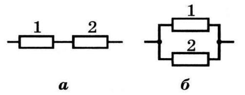 Два резистора сопротивлениями R1 = 5 Ом и R2 = 20 Ом соединены так, как показано на рисунке (а и б).