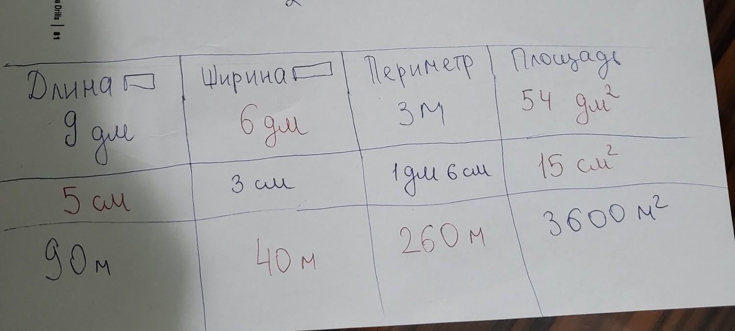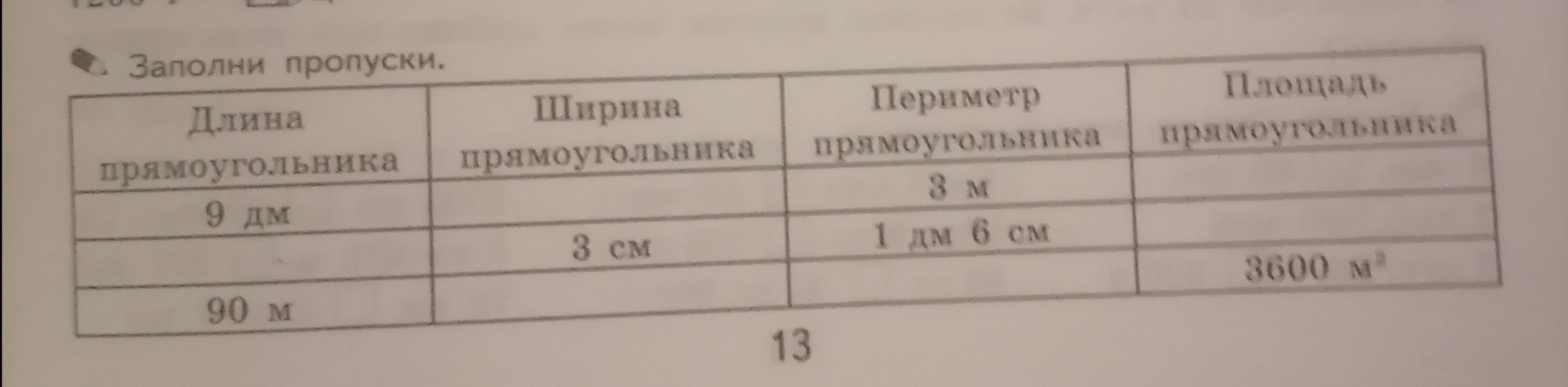Помогите ПЖ Заполни пропуски длина прямоугольника 9 дм 90м ширина прямоугольника 3 см периметр прямоугольника 3 м 1 дм 6 см площадь прямоугольника 3600м2