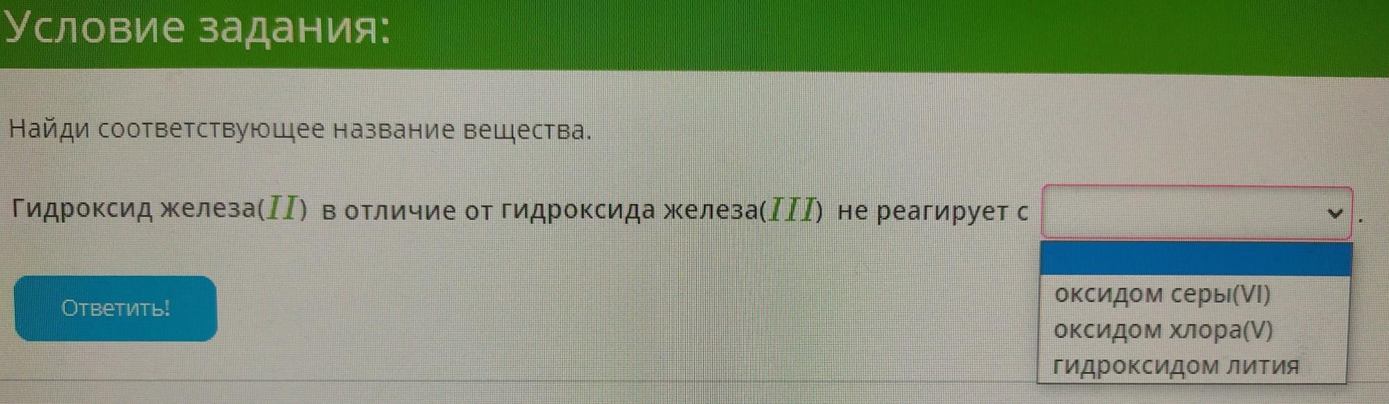 гидроксид железа (II) в отличие от гидроксида железа (III) не реагирует с гидроксидом лития, так как тоже обладает схожими основными свойствами. А гидроксида железа (III), напротив, обладает слабыми амфотерными свойствами.