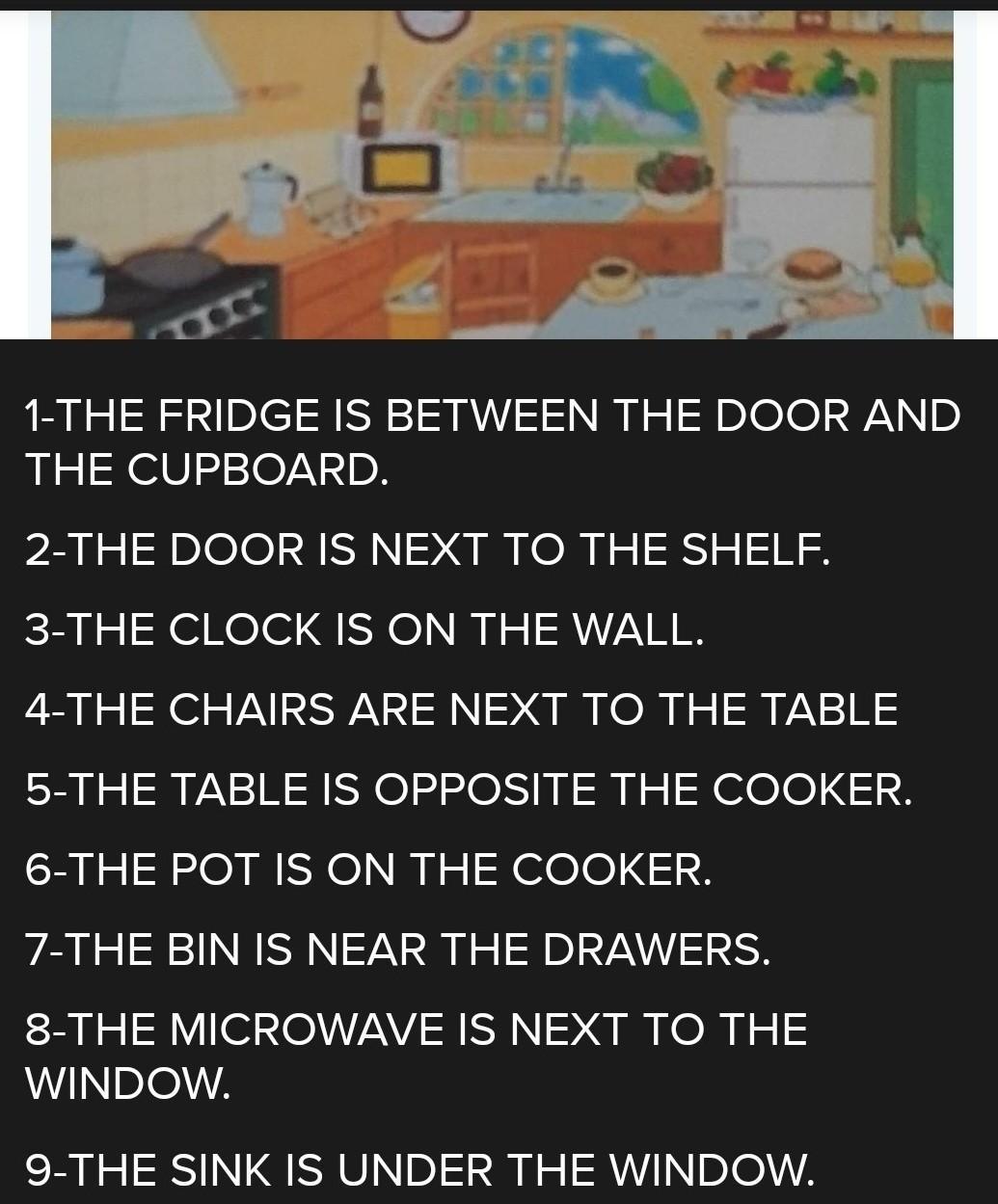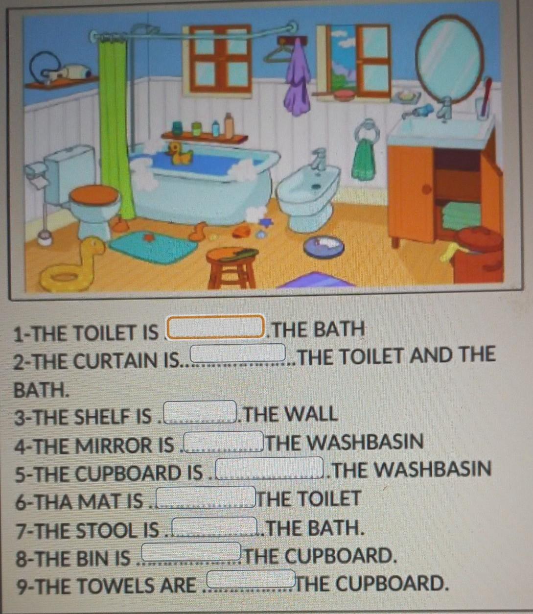 1-THE TOILET IS 1. THE BATH 2- THE CURTAIN IS. ..THE TOILET AND THE BATH. 3-THE SHELF IS.... THE WALL 4-THE MIRROR IS...THE WASHBASIN 5-THE CUPBOARD IS .........THE WASHBASIN 6-THA MAT IS...........THE TOILET 7-THE STOOL IS THE BATH 8-THE BIN IS... THE CUPBOARD. 9-THE TOWELS ARE THE CUPBOARD.