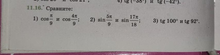 cos(pi/9) > cos((4*pi)/9); sin((5*pi)/9) > sin((17*pi)/18); tg100 > tg92