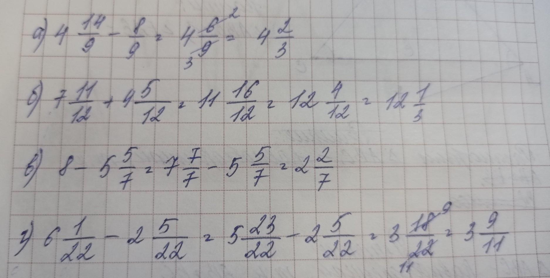 Ришите пж даю 45 баллов номер восемь . Выполните действия.а )5 5/9-8/9 б)7 11/12+4 5/12 в)8-5 5/7 г)6 1/22- 2 5/22