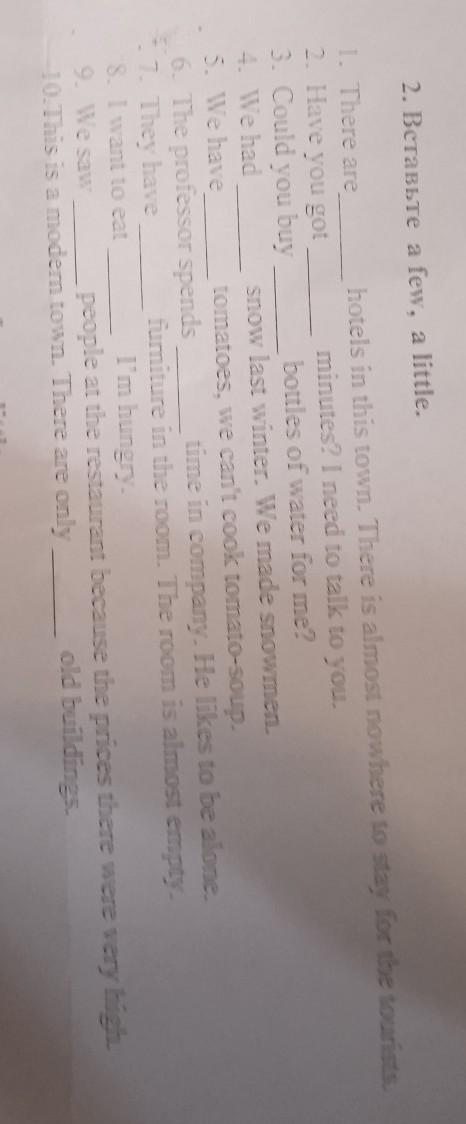 2. BetaBbte a few, a little. 1. There are hotels in this town. There is almost nowhere to stay for the tourists. 2. Have you got minutes? I need to talk to you. 3. Could you buy bottles of water for me? 4. We had snow last winter. We made snowmen. s. We have tomatoes, we can't cook tomato-soup. 6. The professor spends time in company. He likes to be alone. 7. They have furniture in the room. The room is almost empty. S. I want to eat I'm hungry. 9. Iesaw people at the restaurant because the prices there were very high. 10. This is a modern town. There are only old buildings. помогите пожалуйста