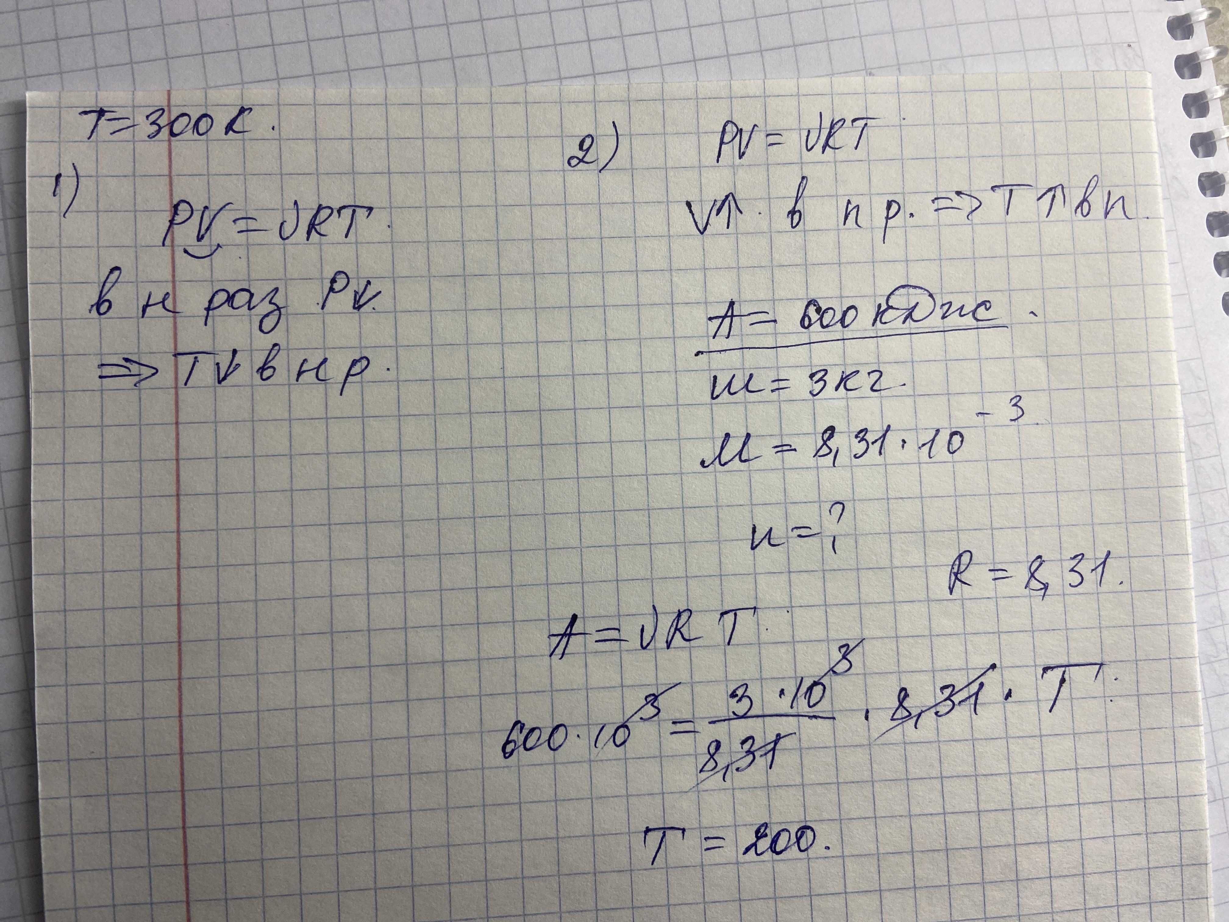 Объяснение: во втором случае работа совершается, если работа равна 600 кДж, то при расширении увеличилась и температура , так-как процесс изобарный. Находим температуру= 200, значит для достижения 600 надо на 3 умножить