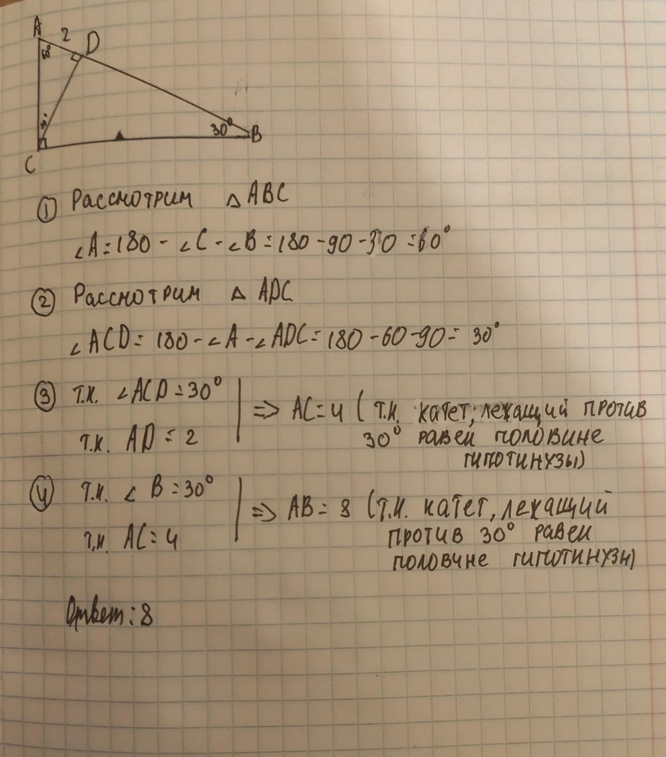 В прямоугольном треугольнике ABC, где кут C-90°, проведена высота CD. Известно, что AD 2 см, а B=30°. Най- дите AB.
