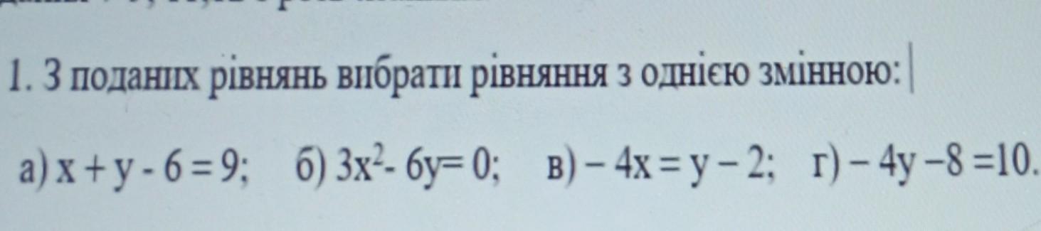 УМОЛЯЮ ПОЖАЛУЙСТА ОЧЕНЬ БЫСТРО НУЖЕН ОТВЕТ 1. З поданих рівнянь вибрати рівняння з однією змінною: а) x+y - 6 = 9; б) 3х²- 6у = 0; в) - 4x=y-2; г) - 4у -8 =10.
