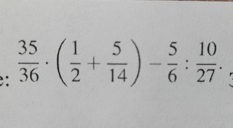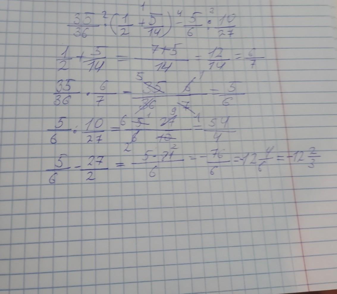 первое действие в скобках. 1/2+5/14 к одному знаменателю 14 получаем 12/14 сокращаем, 6/7