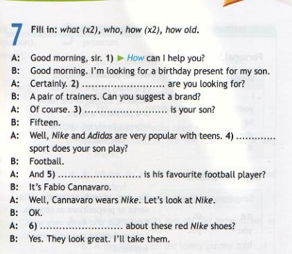 в 3 how old (сколько лет вашему сыну? 15), в 5 - who (кто его любимый футболист), в 6 - how (как начет этих ботинок)
