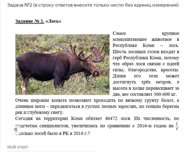 Сегодня на территории Коми обитает 46472 лося их численнность по подсчетам специалистов увеличилась по сравнению с 2016г на 1/3 сколько лосей было в РК в 2016г?