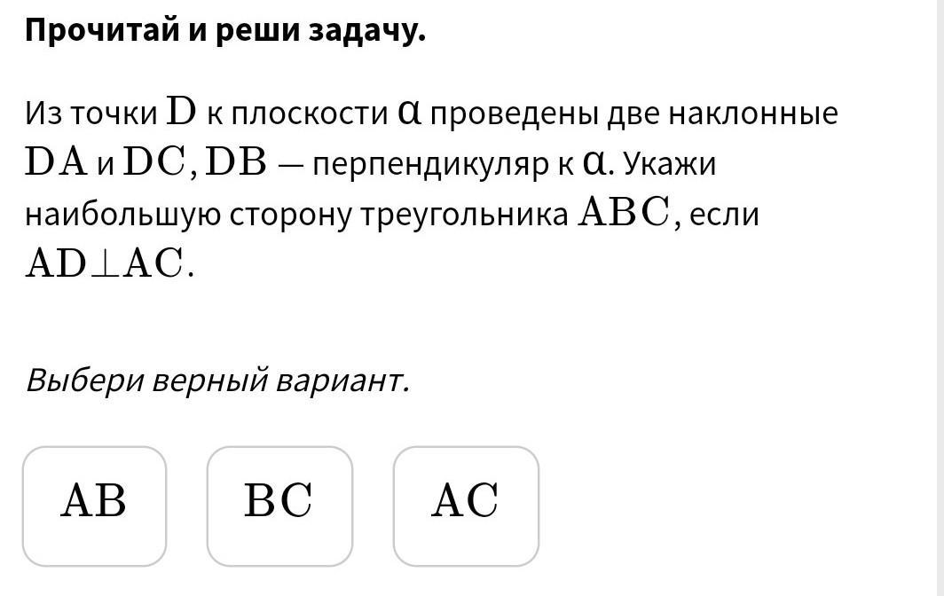 Из точки DD к плоскости {\alpha}α проведены две наклонные DADA и DCDC, DBDB — перпендикуляр к {\alpha}α. Укажи наибольшую сторону треугольника ABCABC, если AD{\bot}ACAD⊥AC. ПОМОГИТЕ ПОЖАЛУЙСТА надо срочно