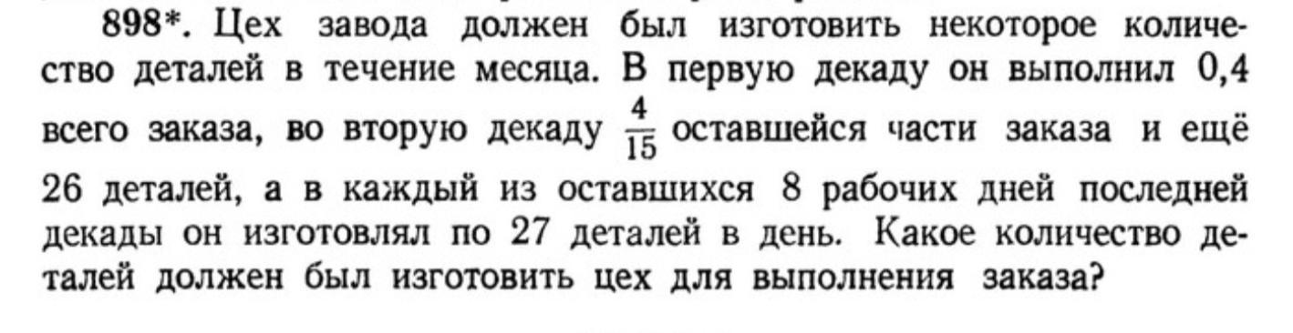 Пусть x – общее количество деталей, тогда 4/15*0,6x+26 — количество деталей изгатовленных во 2-ю декаду