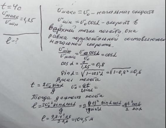 Тело бросили под некоторым углом к горизонту с поверхности земли, через 4 секунды тело упало обратно. Определите дальность полета тела, если его максимальная скорость в процессе движения в 1,25 раза больше минимальной. Силу сопротивления воздуха считайте малой. Какие законы Вы использовали для описания движения? Обоснуйте их применение к данному случаю.