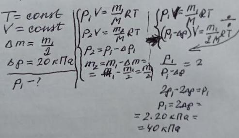 Після того як із жорсткого балона за незмінної температури вийшло половина газу, тиск у ньому зменшився на 20кПа. Визначити початковий тиск газу у балоні.