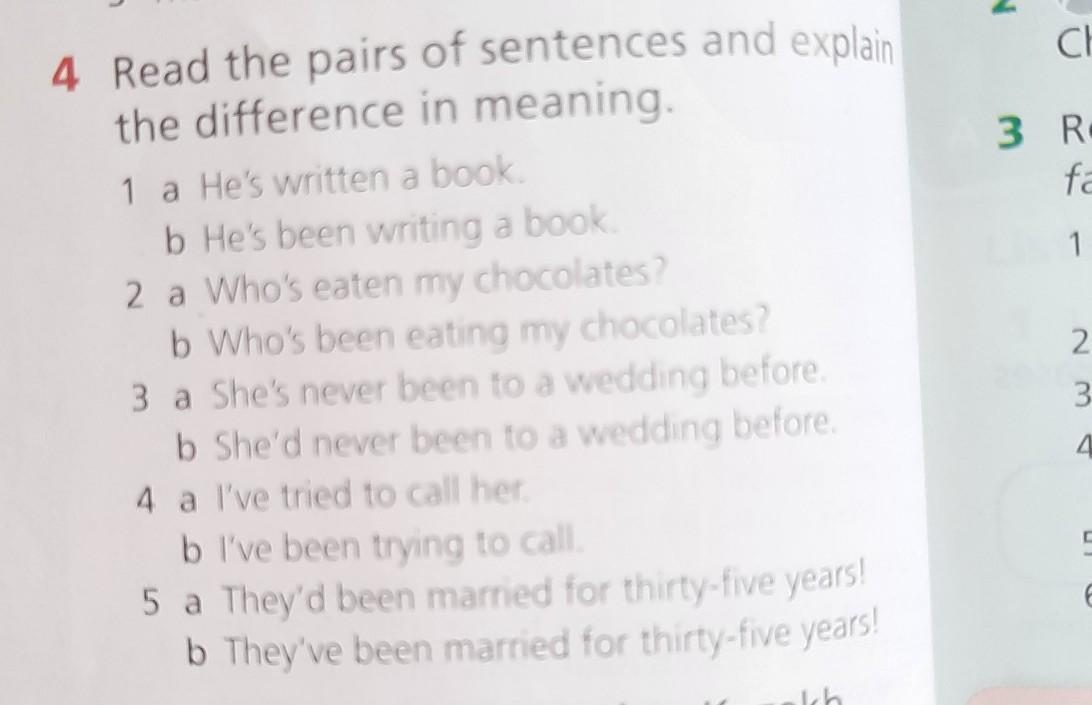 4 Read the pairs of sentences and explain the difference in meaning. 1 a He's written a book. b He's been writing a book. 2 a Who's eaten my chocolates? b Who's been eating my chocolates? 3 a She's never been to a wedding before. b She'd never been to a wedding before. 4 a I've tried to call her. b I've been trying to call. 5 a They'd been married for thirty-five years! b They've been married for thirty-five years! 10