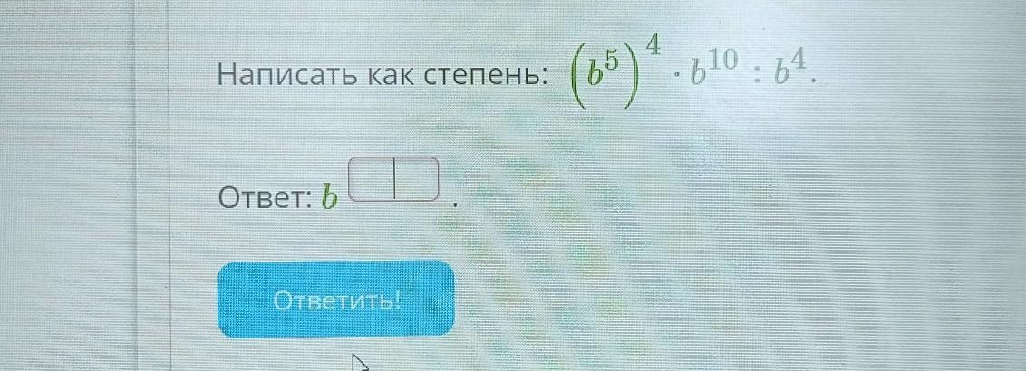 Написать как степень (b⁵)⁴×b¹⁰÷b⁴ Ответ: