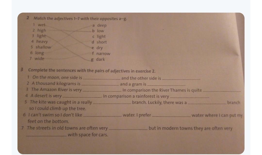 2 A thousand kilograms is____and a gram is__ 3 The Amazon River is very___In comparison the River Thames is quite___ 4 A desert is very___ In comparison a rainforest is very_____ 5 The kite was caught in a really___ branch. Luckily, there was a_____ so I could climb up the tree. 6 I can't swim so I don't like_____water. I prefer_____water where I can put feet on the bottom. 7 The streets in old towns are often very____but in modern towns they are often very___with space for cars. plz help