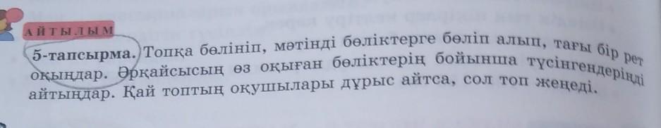 5-тапсырма. Топқа бөлініп, мәтінді бөліктерге бөліп алып, тағы бір рет