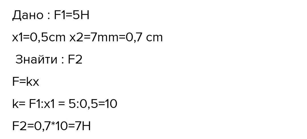 Якщо до пружини прикласти силу 5 Н,вона стиснеться на 0,5 см.Яка сила виникає внаслідок розтягування цієї пружини на 7 мм?