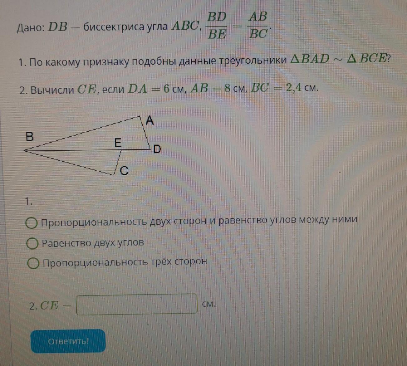 BD/BE=AB/BC ⇒ подобны ΔBAD≅ΔBCE пропорциональность двух сторон и равный угол между ними