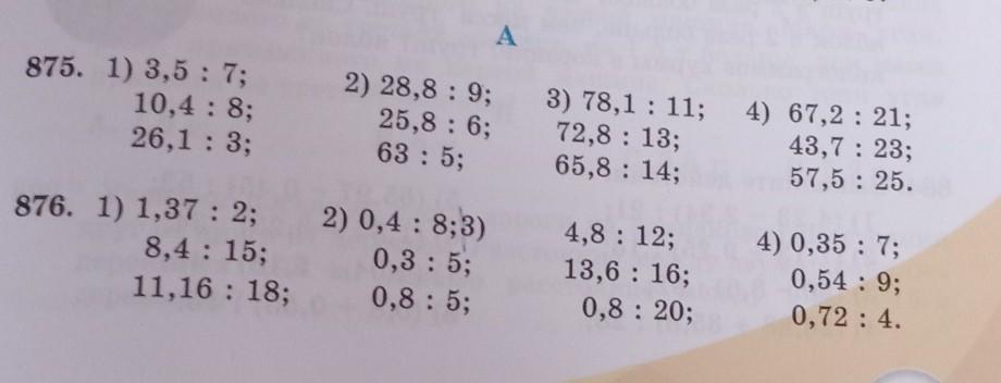 номер 875 3) 78,1: 11; 72,8 : 13; 65,8: 14; 4) 67,2 : 21; 43,7 : 23; 57,5: 25. помогите пожалуйста все в столбик и 876 так же под 3 4