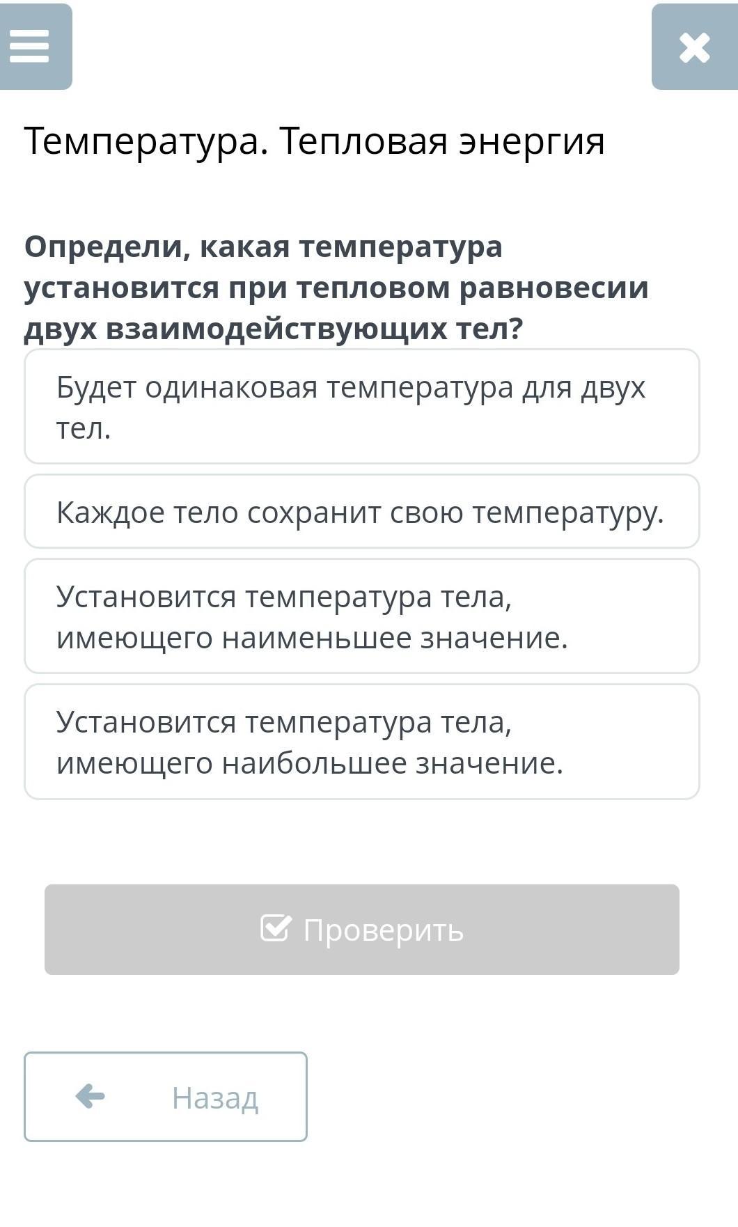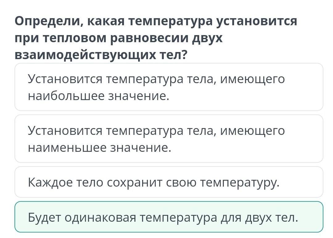 Определи, какая температура установится при тепловом равновесии двух взаимодействующих тел?