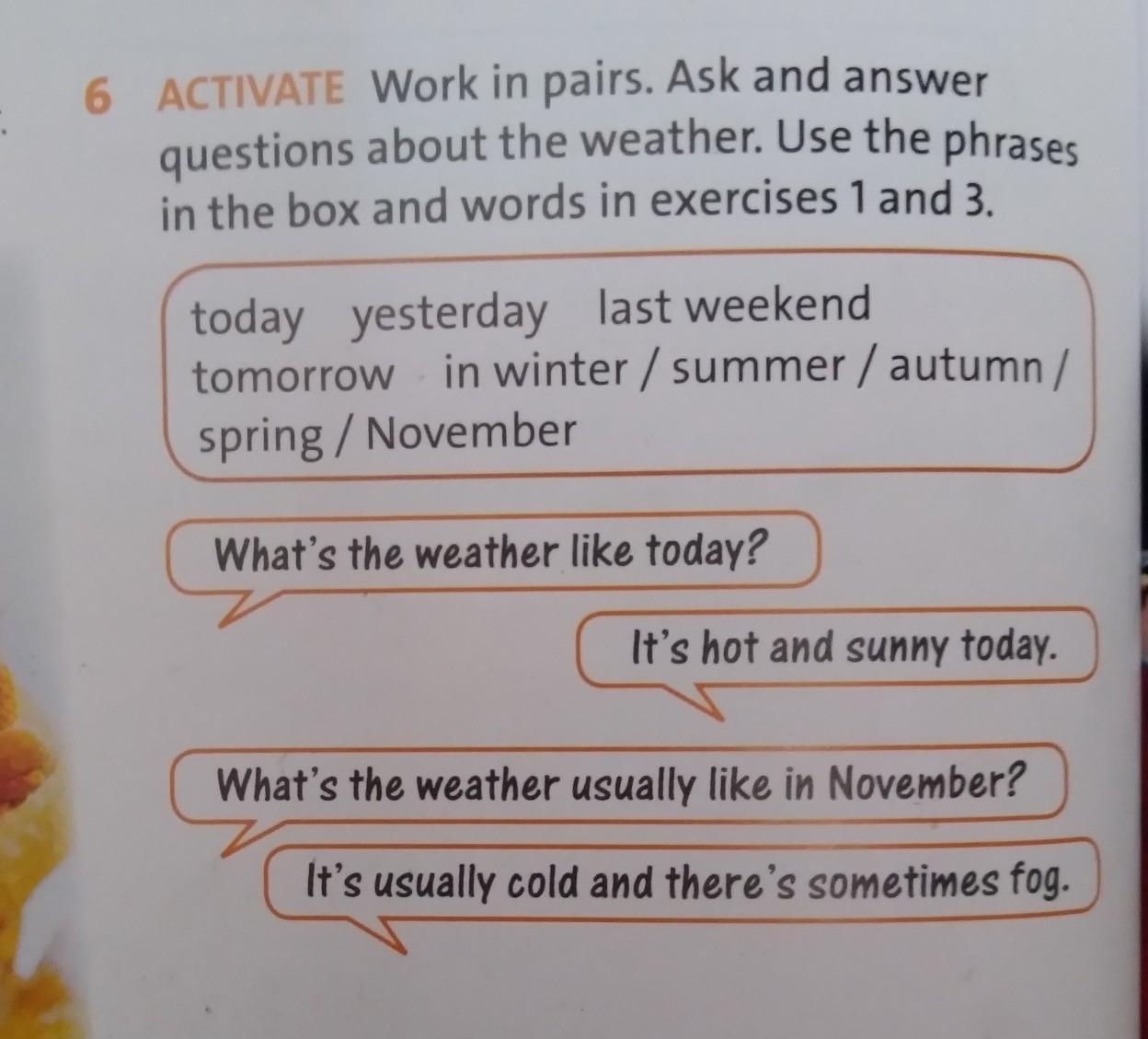 6 ACTIVATE Work in pairs. Ask and answer questions about the weather. Use the phrases in the box and words in exercises 1 and 3. today yesterday last weekend tomorrow in winter / summer / autumn/ spring / November What's the weather like today? It's hot and sunny today.
