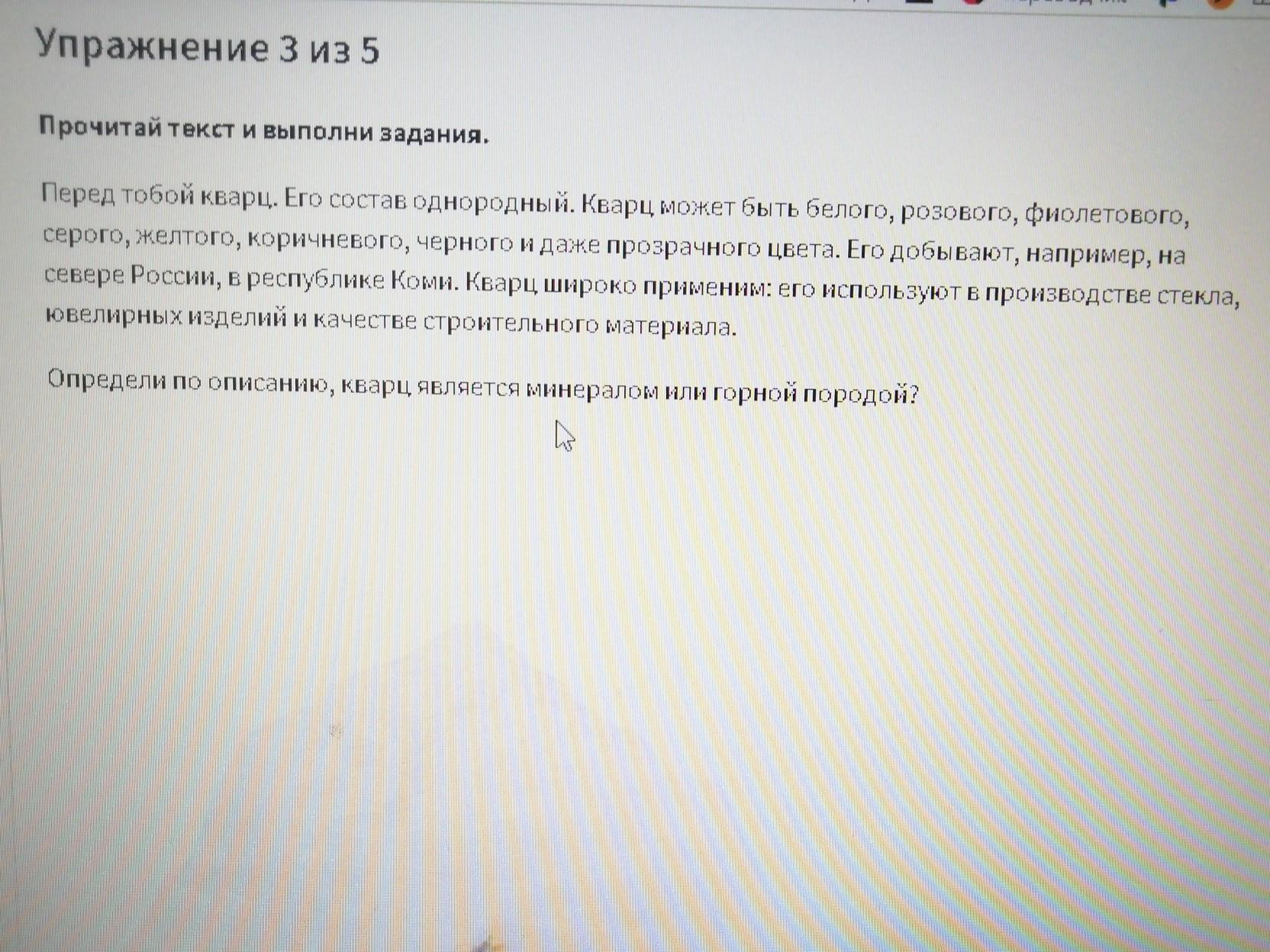 Упражнение 3 из 5 Прочитай текст и выполни задания. Перед тобой кварц. Его состав однородный. Кварц может быть белого, розового, фіолетового, серого, желтого, коричневого, черного и даже прозрачного цвета. Его добывают, например, на севере России, в республике Коми. Кварц широко приіменім: его используют в производстве стекла, ювелирных изделий и качестве строительного материала. Определи по описанию, кварц является минералом или горной породой?