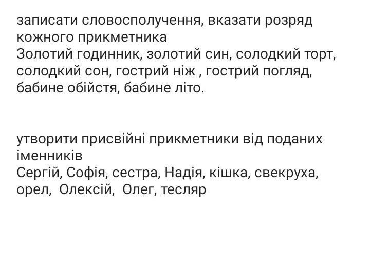 Золотий( відносний) годинник, золотий (якісний) син, солодкий(відносний) торт, солодкий(якісний) сон, гострий(відносний) ніж, гострий(якісний) погляд, бабине(присвійний) обійстя, бабине(якісний) літо.
