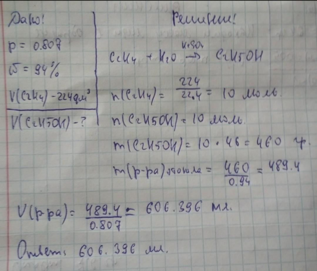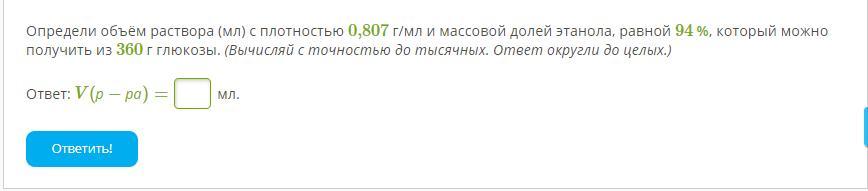 Определи объём раствора (мл) с плотностью 0,807 г/мл и массовой долей этанола, равной 94 %, который можно получить из 360 г глюкозы.