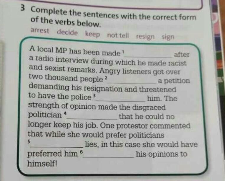 Complete the sentences with the correct form of the verbs below. arrest decide keep not tell resign sign